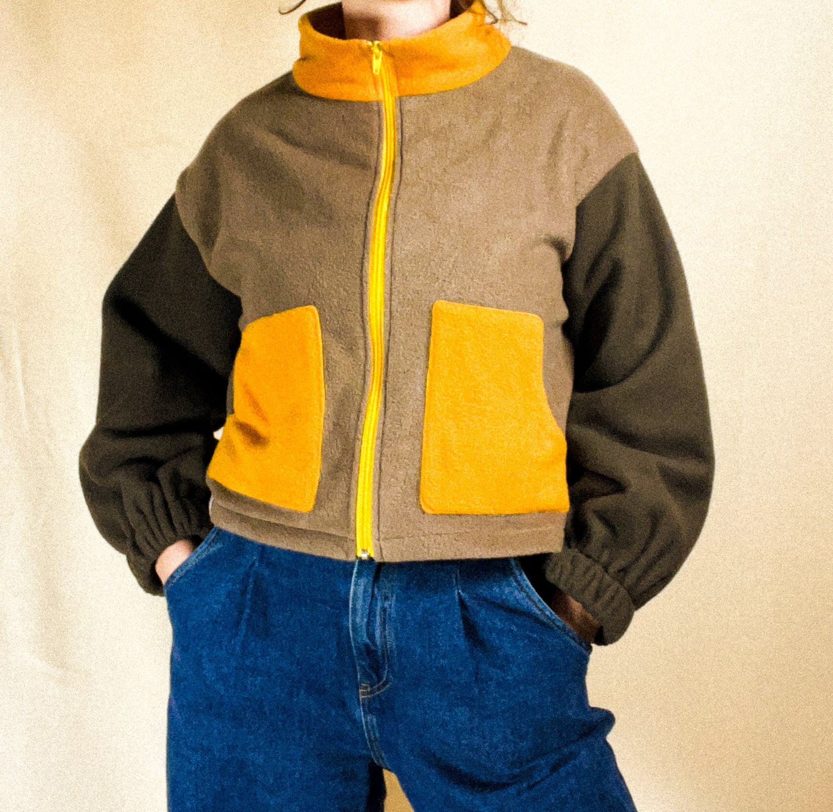 Veste polaire upcyclée, cousue à la main à Liège à partir de tissus de seconde main.
